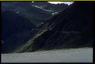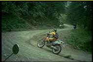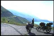 | Etappe 5 Col de Mont Cenis - Guillestre 15.07.98 08.30 Uhr In frischer Morgenluft brechen wir auf. Wir fahren das Tal bis ans Ende und biegen gleich zum Col de Mont Cenis ab. Über diesen Paß soll damals Karl d. Gr. auf seinem Zug nach Langobardien gekommen sein. Für unsere Verhältnisse eine harmlose Anfahrt durch laubwaldgesäumte Serpentinen, oben ein großer Stausee. Wir halten nur kurz, um das obligatorische "Paßfoto" zu schießen. Die Abfahrt nach Susa nimmt kein Ende. Erst jetzt wird klar, wie hoch wir immer noch waren. Immer weiter geht es runter, vorbei an großen Staumauern, es wird immer wärmer. Wir haben endlich die Klimagrenze in den mediteranen Raum überwunden. Pinien, bunte Blumen, in Susa empfängt uns italienische Lebensart. Jetzt suchen wir den kleinen Paß von Finestrelle. Wir finden die kleine Straße, die im Wald an einem steilen Hang beginnt und sich in enorm engen Tornanten mit sehr kurzen Geraden hochschraubt. Der Berg selbst ist oben von Wolken verhüllt. Nach einigen Kilometern plötzlich: Schotter! Kein Sandweg, wie wir ihn kennen, sondern grober, steiniger Schotter, für schmale Reifen nicht gerade einladend . Der Gebirgszug ist durch die Wolken nicht zu erkennen aber weit kann es bis zur Paßhöhe nicht mehr sein, denken wir. Was für ein Irrtum! Immer steiler und unwegsamer wird der Weg. Die Kehren werden unmenschlich eng und steil, und die Paßhöhe ist immer noch nicht in Sicht. Es erfordert schon einige Konzentration, auch mit leichten Motorrädern voll Gepäck auf diesem losen Untergrund um die Spitzkehren zu kommen. Einmal verliert Anja die Kontrolle über ihren 11 PS Boliden und kippt in der Innenseite einer solchen 180° Kehre im Schrittempo um. Kein Schaden entstanden, aber wir machen erst mal Zigarettenpause. Von der anderen Seite des Taleinschnitts hören wir das Grollen großvolumiger Einzylindermotoren näherkommen. Es sind einige einheimische Crossfahrer, die äußerst professionell hier auf ihrer "Hausstrecke" wohl ein wenig üben. Wir jedoch müssen die Strecke auf unseren überladenen und untermotorisierten Mopeds irgendwie bewältigen. Und irgendwie geht es auch. Im Schrittempo mit schleifender Kupplung und viel Gas eiern wir die Steigungen hoch, in einer Kehre muß ich sogar anhalten, Anlauf nehmen und mit viel Schwung über einen besonders losen Schotterabschnitt brettern. Irgendwann erreichen wir erleichtert die Paßhöhe. In den Wolken stehen wir auf dem Berg und treffen dort sogar noch zwei andere Motorradfahrer. In dieser Landschaft bekommt der Gedanke an wirkliche Einsamkeit eine ganz andere Dimension - die Freude, jemanden zu treffen ist dementsprechend groß. Bei der Abfahrt kommt allmählich Endurofeeling auf. Runter rollen ist einfacher. Und dann: Asphalt. Endlich. Wir fliegen! Obwohl es ein einmaliges Erlebnis war, nehmen wir uns vor, zumindest mit diesen Maschinen keine Schotterpässe mehr zu befahren. Beeindruckend an den Abfahrten ist das Wachsen der Berge. Unscheinbare Felsspitzen wachsen zu immensen Bergriesen heran. Mit weiten Ausblicken in das grüne Tal gleiten wir bergab. Richtung Briancon fahren wir dann entspannt auf einer luxuriös ausgebauten Hauptstraße, die sich an einem großen Hang entlang durch ein tiefes Tal windet. Der nächste Paß ist auch eine Hauptstraße und die Grenze zu Frankreich. Den Col de Montgenevere kriechen wir hinter Wohnmobilen und staubenden Lastwagen hinauf, durchfahren das hochgelegene Sestriere und gelangen schließlich nach Briancon. Eine wunderschön gelegene, sehr alte Stadt mit mehreren mittelalterlichen Festungen rundherum auf Bergvorsprüngen. Dazu ist es die höchstgelegene Stadt Frankreichs. Wir kaufen in einem Einkaufszentrum Proviant ein und tanken. Dabei macht uns die Hitze sehr zu schaffen. Bei über 30° schwitzen wir in unserer, immer noch auf Fahren in deutlich höheren Lagen abgestimmten Motorradkleidung. Nach einigem Suchen durch dichten Verkehr finden wir den Weg zum Col d´Iozard. An die ständigen Irrfahrten in Frankreichs Städten muß man sich gewöhnen. Die Beschilderung ist einfach unmöglich. Der Paß entschädigt dann aber für das Generve. So ungefähr stelle ich mir Kanada oder Alaska vor! Sandiges, poröses Erosionsgestein, Nadelbäume, rötliche und gelbe Farbtöne. Höher präsentiert sich das Landschaftsbild karstig und ohne Grün. Aus breiten Schuttflächen ragen schroffe Felsen wie Zähne auf. Auf der Paßhöhe offenbart sich abermals ein traumhafter Blick auf die Berge weit vor und hinter uns. Wir sind verwundert, daß es hinter jedem Paß noch so viele weitere Gebirgszüge gibt und daß jeder Ausblick anders aussieht. Obwohl wir uns in knapp 2400m befinden, ist es recht mild. Man spürt die südlichen Gefilde. Der Weg nach unten führt durch schwarzwaldähnliche Landschaften in eine atemberaubende Schlucht mit bedrohlich über die Fahrbahn hinausragenden Felsen. Gemeinsam mit dem wilden Gebirgsfluß zwängt sich die Straße durch das enge Tal, durchstößt immer wieder das Gestein in unbehauenen Tunneln. Gegen Abend erreichen wir Guillestre, wo wir auf einem schönen, terrassenförmig angelegtem Campingplatz unser Lager aufschlagen. Reichlich erschöpft trinken wir noch eine Flasche Wein und genießen den Sonnenuntergang über dem weiten Tal. | | |