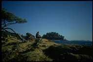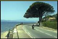 | 17.07.98 - Cote d´azur Mit dröhnenden Schädeln unter heißer Mittagssonne bauen wir ohne Frühstück unser Zelt ab. Wir fahren weiter nach Westen. Durch volle Touristenstädte aber auch schöne Landstriche fahren wir bis St. Tropez. Im wilden Hinterland des Nobelortes speisen wir in einem skurrilen Imbiß: In einem afrikanisch anmutenden, halboffenen Bambusverschlag bekommen wir von drei herzigen Damen vom Grill ein deftiges Steak samt dazugehörigen Nachtisch serviert: ein Pfirsich. Wieder an der Küste, kämpfen wir uns durch überfüllte Badeorte voran, fahren nur noch im T - Shirt. Hinter Le Lavandou suchen wir uns einen der zahlreichen Campingplätze aus. Auf einem Hügel gelegen bauen wir unter Pinien unser Lager auf. Über Schatten kann man hier dankbar sein, denn die Sonne steht den ganzen Tag steil am Himmel und brennt unbarmherzig. Obwohl wir uns immer wieder mit Sonnenöl einreiben, macht sich der Sonnenbrand bereits bemerkbar. Abends schnappen wir uns noch mal die Jawa und kundschaften leichtbekleidet und endlich einmal ohne Gepäck die Gegend aus. Nach einer längeren Fahrt durch wilde Pinienwälder finden wir hinter einem kleinen Gebirgszug ein traumhaftes Fleckchen Strand. Nicht das typische Bild überquellender, lauter Touristenstrände, sondern anscheinend eher so etwas wie ein Geheimtip der Einheimischen. Eingerahmt von Felsen eine schöne Bucht, davor liegt eine kleine Insel mit einer alten Burg aus napoleonischer Zeit. Wir beschließen, morgen wieder hierher zu kommen und einen Tag am Meer zu verbringen. Mit der Dämmerung kehren wir zum Campingplatz zurück und beschließen den heißen Tag mit einer frisch abgefüllten Flasche Rosé vom Weinhändler, der auf dem Gelände seinen Laden hat. Vom Nachbarcampingplatz hören wir dumpf die Musik der Partyband herüberschallen, die dort die gelangweilten Camper animieren soll. Wir sind froh, unsere Ruhe zu haben. | | |