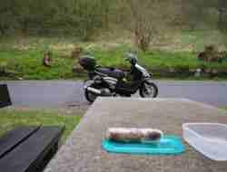 19.04.2003 Kaum zu glauben, aber um 5:02 Uhr morgens sitze ich im ICE und rausche in die Morgendämmerung. Bei mir habe ich eine grosse Gepäckrolle mit Zelt und Schlafsack, einen gut bepackten Rücksack und ein riesiges, prall gefülltes Topcase, das ich an den Roller montieren werde. Wird schon klappen. Die vergangenen Tage habe ich mit Planen, Überlegungen und Besorgungen verbracht, bin immer wieder die Checkliste durchgegangen, so dass jetzt eigentlich nichts mehr schiefgehen kann. Um 11 Uhr morgens treffe ich in Bad Vilbel ein und werde vom Händler "Esso Kloos" am tristen Bahnhof abgeholt. Er betreibt tatsächlich eine Tankstelle, die nebenbei Gebrauchtwagen sowie Motorroller verkauft. Während ich im Nebenzimmer mit dem Chef die Formalitäten abwickle, montiert Junior in der Werkstatt mein mitgebrachtes Nummernschild und das als "ganz schön gross" bezeichnete Topcase. Überhaupt sorgte meine Menge an Gepäck für skeptische Kommentare. Ohne dass ich den Roller auch nur einmal angelassen habe, steht er bepackt vor mit und ich muss losfahren. Die ersten Meter sind ernüchternd. Die Gepäckrolle klemmt auf dem Rücksitz und ist viel zu gross, ich hocke viel zu weit vorn. In der ersten Kurve schiebt die Fuhre katastrophal über das Vorderrad, so dass mir Angst und Bange wird. Also, so haut das alles nicht hin. Erstmal Reifendruck prüfen. 0,7 Bar vorn und 1.0 hinten offenbart das Tankstellen Barometer. Aha, soviel also zur Übergabeinspektion. Mit prallen Reifen und der Hoffnung, dass der Mechaniker wohl nicht auch vielleicht das Motoröl vergessen hatte, geht es weiter. Das Gepäckproblem habe ich auch gelöst. Statt hinten quer, verstaue ich die grosse Gepäckrolle nun hochkant vor der Sitzbank zwischen meinen Beinen. Dies stört beim Fahren kaum und füllt einen beim Roller sonst ungenutzen Raum. So, alles ist jetzt klar und ich kann mich voll auf meine Tour konzentrieren. Jetzt erst nehme ich den Charakter des Rollers wahr. Im Vergeich zu meinem kleinen 100er Yamaha wirkt er schwerfällig, obwohl der Benelli auch bloss 130 kg wiegt. Aber das Fahrverhalten ist ausgewogen, satt und "erwachsen". Der Motor läuft weich und kuppelt sanft ein. Ich hatte mir einen Sportroller bissiger vorgestellt, aber ich habe keinen Grund zur Klage. Die Reifen allerdings, das wird mir nach wenigen Kilometern klar, sind auch aufgepumpt eine Katastrophe. Absolut kurvenunwillig laufen sie jeder Spurrille hinterher, selbst kleine Fahrbahnmarkierungen stören die Linie. Ich werde sie austauschem, sobald es geht. Ich befinde mich mitten im Ballungsraum Frankfurt am Main, und mein heutiges Ziel ist Stuttgart. Eigentlich eine 2 1/2 Stunden Fahrt, wenn man den schnellen Weg nimmt. Ich will natürlich die Fahrt geniessen und bevorzuge die schönen Landstrassen. Zunächst will ich den Main ein Stück hinauffahren und dann durch den Odenwald. Aber es klemmt. Für die ersten 60 Kilometer brauche ich 2 Stunden. Dicht an dicht reihen sich die Ortschaften, der Verkehr stockt immer wieder und ich bin froh, als ich endlich auf die Schnellstrasse in Richtung Miltenberg komme. Da ich vorhabe, den erst wenige Kilometer jungen Motor nach 'alter Sitte' einzufahren, belasse ich es zunächst bei Geschwindigkeiten zwischen 90 und 100 km/h. Die Maschine liegt ruhig und läuft unangestrengt und leise. Der Windschutz der kleinen Scheibe ist in Ordnung, dafür weht es ganz ordentlich um die Beine. Nun ja, es ist schliesslich auch kein Ohrensessel wie Burgman und Co. Die Sitzposition ist angenehm aufrecht und "prompt". Man kann die Füsse nach Belieben entspannt etwas nach vorn schieben, oder bei kurvigen Passagen motorradähnlich weiter nach hinten, was eine wesentlich bessere Fahrzeugkontrolle erlaubt. 100 Punkte hierfür. Im Odenwald fängt es an zu nieseln, es wird bitter kalt und ich fahre 36 Kilometer in die falsche Richtung. Super. Ich wünsche mir meine BMW her, mit Heizgriffen und Boxer Motor. Ich habe furchtbar kalte Füsse und Hände. Endlich komme ich an den Neckar, die Sonne kommt wieder raus und ich geniesse die schöne Strecke den Fluss entlang bis nach Stuttgart. Dort habe ich die Wohnung von Richard und Mone zur Verfügung, die sich - zusammen mit Anja - in Indien in einem Luxushotel aufhalten. Ich hingegen freue mich wahnsinnig auf meine Tour durch die heimischen Kostbarkeiten.