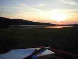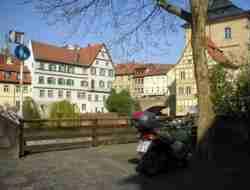 23.04.03 Um 9:30 Uhr gebe ich den Roller bei dem Mechaniker des kleinen Rollershops auf dem Lande ab und bekomme einen Daelim Otello als Leihfahrzeug in die Hand gedrückt. Mit diesem mache ich mich auf, um Bamberg von seiner schönen Seite kennen zu lernen und die wichtigsten Sehenswürdigkeiten zu besichtigen. Ich parke den Hobel beim alten Rathaus, dass mitten in die Regnitz gebaut ist, den Fluss, der Bamberg früher in Bischofs- und Bürgerstadt unterteilte. Der berühmte romanische Dom ist beeindruckend und enthält viele Statuen, die in jedem Geschichtsbuch zu sehen sind. In dieser Kirche haben ausserdem ein Papst und Kaiser Heinrich II ihre letzte Ruhestätte gefunden. Ich wandere durch die Altstadt, schaue mir die alten Bauten an und gegen Mittag starte ich den Leihroller und fahre zurück, um den Benelli wieder abzuholen. Der Umstieg von dem Otello auf den 250er Velvet macht klar, das dieser doch in einer ganz anderen Liga spielt. Der Daelim wirkt dagegen wie ein farbloses Nutzfahrzeug. Das Ziel für heute hatte ich bereits festgelegt: Raus aus Bayern, hin nach Thüringen. Zuvor sollte jedoch noch im Reiseführer als eine der schönsten deutschen Landschaften beschriebene Fränkische Scweiz unter die Räder genommen werden. Die Hauptstrasse südlich nach Forchheim ist wieder mal voll mit LKWs. In Forchheim soll sich eine Karolingische Pfalz befunden haben, die ich noch sehen will. Die Pfalz ist jedoch eine einzige Baustelle und nicht zu besichtigen. Die Fränkische Schweiz zeichnet sich durch besonders stark befahrene Strassen aus an diesem Tag. Ich bin offenbar besonders gern auf Strassen unterwegs, die auch bei LKW Fahrern beliebt sind. Entweder kriechen sie im Schneckentempo durch die schönen Täler vor einem her, oder drängeln in Form von Kleintransportern bei wahnsinnigem Tempo von hinten. Die Bäume auf den Bergen hier sind mit ihren Blättern vergleichsweise spät dran. Der Laubwald ist noch winterstruppig. Ich verlasse Franken nordöstlich in Richtung Kulmbach, Kronach. Von Nord weht mir ein kalter Wind entgegen, beim Picknick muss ich meine Jacke anbehalten. Wenn das Wetter so bleibt, erwäge ich, statt zu zelten, lieber ein Zimmer irgendwo im Thüringischen Wald zu nehmen. Auf der B 4 fahre ich in durch den Wald, als ich plötzlich an einem Stausee am Ufer einen Campingplatz entdecke. Obwohl ich ahne, dass es kalt werden könnte, kann ich nicht widerstehen, hier mein Zelt aufzuschlagen. Fast allein auf der riesigen Zeltwiese am Ufer, eine Freizeitanlage aus DDR Zeiten, lasse ich die Sonne über dem See untergehen. Die Nacht wird bitter kalt. Mit allem was ich anzuziehen habe, kauere ich in meinem Schlafsack und bibbere dem Ende der Nacht entgegen. Anja schreibt, in Indien sind 35 Grad.