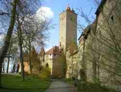 21.04.03 "Warm, aber regnerisch im Südwesten", so die Kernaussage des Wetterdienstes. Für mich ist also die Richtung vorgegeben, in die ich nun aufbrechenn werde: Nordosten. Ohne genaues Ziel mache ich mich früh morgens auf den Weg. Es gibt nichts herrlicheres, als in der Morgenfrische schon im Sattel zu sitzen und einen ganzen Tag auf dem Motorrad - Entschuldigung - Roller vor sich zu haben. Das Wetter super, die Landschaft schön, die Ziele frei. Oben auf den Kaiserbergen nehme ich mein Frühstück, fahre dann über Schwäbisch Gmünd ins Fränkische. Auf kleinen, einsamen Strassen geht es über Ellwangen in Richtung Dinkelsbühl. Es ist erstaunlich, wie anders das Gesicht dieser Region im Vergleich zum Schwäbischen wirkt. Der Tank ist ständig leer. 11 Liter passen rein, bei einem Verbrauch von knapp über drei Litern müsste das eigentlich reichen, aber die Reservewarnleuchte blinkt immer schon viel zu früh auf und nervt. Bei meinen Tagestouren vom 300 Kilometern kommt man mit einer Tankfüllung nicht aus. Aber ich denke, von solchen Touren ist man bei der Auslegung des Rollers schlicht nicht ausgegangen. In Dinkelsbühl komme ich nicht durch, da die Stadt gesperrt ist. Eine Stadterkundung habe ich nicht vorgesehen, zumal ich die mittelalterliche Anlage bereits von einer Tour vor 2 Jahren kenne. Damals waren wir von hier weiter ins Altmühltal gefahren, und genau dies habe ich heute auch vor. Als ich gerade die Umleitung um das gesperrte Stadtzentrum nehmen will, blinkt mit ein Wegweiser in den Augenwinkel: Rothenburg ob der Tauber. Mensch, da wollte ich doch schon immer mal hin, denke ich und verwerfe kurzerhand meinen Plan. Es sind nur knapp 40 Kilometer dorthin und ich hätte noch genug Zeit, mir die einzigartige Stadt anzugucken. In brütender Nachmittagssonne schlage ich das erste Mal in diesem Jahr mein Zelt auf. Dann, ebenfalls eine Premiere in diese Saison, fahre ich in Shorts und T- Shirt mit dem Roller an eines der Stadttore und schlendere durch die Mittelalterkulisse. Die berüchtigten Touristenmassen, vor denen sogar im Reiseführer gewarnt wird, halten sich sogar in Grenzen. Wahr ist allerdings, das hier auffallend viele Japaner anzutreffen sind. Abseits der Hauptstrassen kann man durch die idyllischen Gassen und entlang der Befestigungsanlage bummeln. Pflichtprogramm für mich ist natürlich die Besteigung des Rathausturmes. Über eine ausserordenlich enge und verwinkelte Treppe gelangt man bis hinauf auf den Helm des über 50 Meter hohen Turmes. Der Ausblick auf die in malerischer Landschaft liegenden Stadt mit ihren vielen Dächern und Gassen ist traumhaft. Von einem auf einem Vorsprung vor der Stadt liegenden Park geniesse ich noch lange den Blick in das liebliche Taubertal, die Abendsonne versetzt alles in stimmungsvolles Licht. Mit der einsetzenden Dunkelheit verkrieche ich mich in mein Zelt.