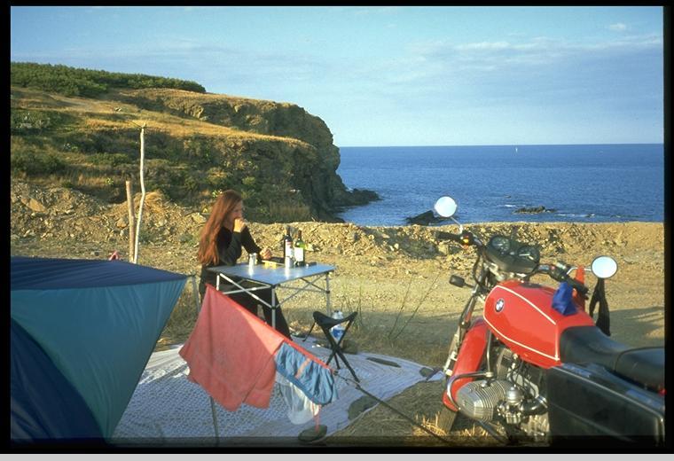 Vor uns nur die Fototapete mit dem endlosen Meer und weiss leuchtenden Segelbooten. Eine leichte bis starke Brise zerzaust die Haare und manchmal das Zelt, die Luft duftet nach Salz und Algen, Möwen kreischen. Hier bleiben wir ein paar Tage! Wir richten uns häuslich ein und erobern gepäcklos die Umgebungsberglein. Der Wind vom Meer nimmt zu. Am nächsten Tag müssen wir das Zelt mit allen verfügbaren Heringen abspannen. Immerhin hält diese "Brise" die Wolken über den Pyrenäen noch auf Abstand. | |
