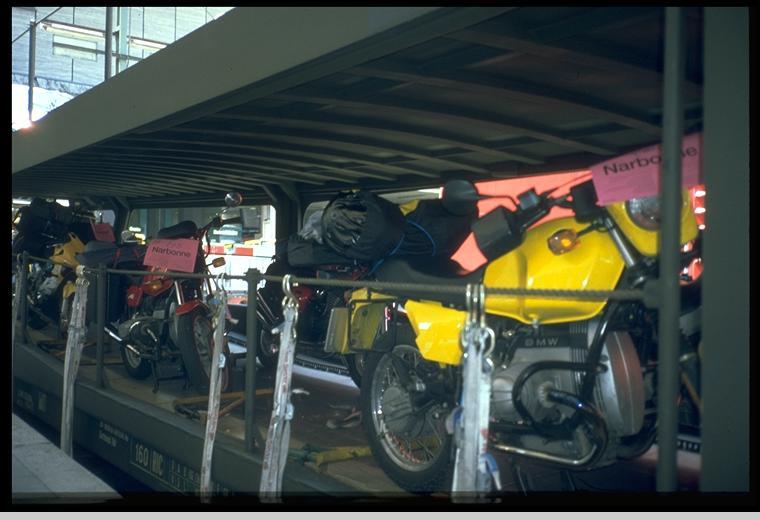 Gegen halb 12 sollen wir am Bahnhof sein, alles ganz entspannt. Gestern Abend sah alles noch anders aus: Auf dem Weg von der Arbeit nach Hause lief die Gelbe plötzlich nur noch auf einem Topf. Panik, Katastrophe. Um die Reise nicht platzen zu lassen, hatte ich mir bereits die Option auf die R 45 von Carsten geholt, der sie mir dankenswerterweise zur Verfügung gestellt hätte. Trotzdem war ich noch heute Morgen um 7:30 Uhr bei der freundlichen BMW Niederlassung vorstellig. Nachdem ich von unseren Reiseplänen erzählte, wurde mir prompt geholfen. Innerhalb von 10 Minuten war der Vergaser repariert und die Gelbe brabbelte wieder zufrieden. Zusammen mit einer Horde wüster schwedischer Harleys werden die Rote und die Gelbe nun auf dem Unterdeck des Autozugs festgezurrt. | |