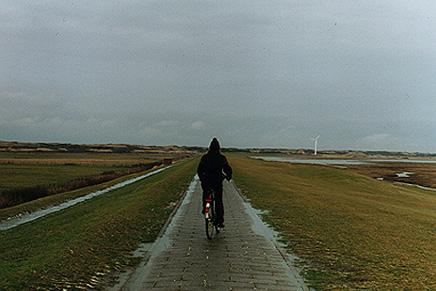28.12.2000 Mobilität hergestellt Lange faul ausgeschlafen, nach dem Frühstück warm anziehen und los zum Fahrradverleih. Bei einem nicht serviceorientierten Kerl Drahtesel der Hollandfraktion ausgeliehen. Chopperfeeling, fremdgesteuert auf rutschigem, angetautem Boden dem Horizont entgegen. Dem eiskaltem Wind entgegengestemmt hatten wir schnell viele Ausblicke auf das graue Meer vor grauem Himmel. Der riss manchmal auf, etwas Sonne blitzte durch die Wolken und bescherte uns schönste Stimmungen auf den endlosen Deichen. Als Krönung kam dann noch die Inselbahn am Horizont entlanggetuckert! Durchgekühlt wärmten wir uns bei Pharsäer und Käsemandarinenapfelkuchen am Flughafen, wo Thorsten mich in die Untiefen der Flugphysik einführte, die Knochen auf. Einkauf und ins Zimmer. Vorlesezeit. Thema: die Merowinger.Pflege und Aufzucht. Während der Mann das Überleben am Computer sichert, macht die Frau dasselbe in der Küche. Essen, Wein, lesen, www.anjaleonhardt.de entsteht. Draussen liegt wieder Schnee.