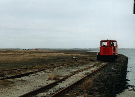 29.12.2000 Eisenbahntag (ächz). Mit unseren Astralkörpern auf die ergodynamischen Gefährte geschwungen und bei extremen Eiskaltwind direkt von vorn strampelten wir uns im 1.Gang Schweissperlen auf die Stirn, die dort sofort gefroren. Getoppt wurde das Ganze durch den Anblick von gleich ZWEI (in Worten: 2) entzückenden Inselbahnen - eine im Bahnhof, eine fuhr gerade darauf zu . Als ich mich in den Anblick der direkt an der Wasserlinie fahrenden Kinderbuchbahn versenken wollte, wurde ich von einem anderen Eisenbahnfan grob zur Seite geschubst, weil ich den besseren Aussichtspunkt hatte. Frustriert blieb mir nichts, als mich der Natur zuzuwenden. Melancholisch stapfte ich zwischen Sandwolken herum, blickte auf das grausige, aufgewühlte Meer, dessen Gischt von der Sonne grellweiss vor dem schwarzen Himmel leuchtete. Thorsten war von dem Bahnhof nicht wegzulocken, also machte ich allein auf den Weg ins ungewisse Inselinnere. Als ich mir auf den Dünen eine Orientierung verschaffen wollte, musste ich feststellen, dass das Abkommen vom Weg streng verboten war und dieses mit mehrschichtigen Stacheldrahtzäunen und Holzpalisaden betont wurde. Völlig hilf-und orientieungslos war ich den Tränen nahe, als endlich mein Wikinger auf seinem Stahlross am Horizont auftauchte und mir heimleuchtete. | ![]() | |||