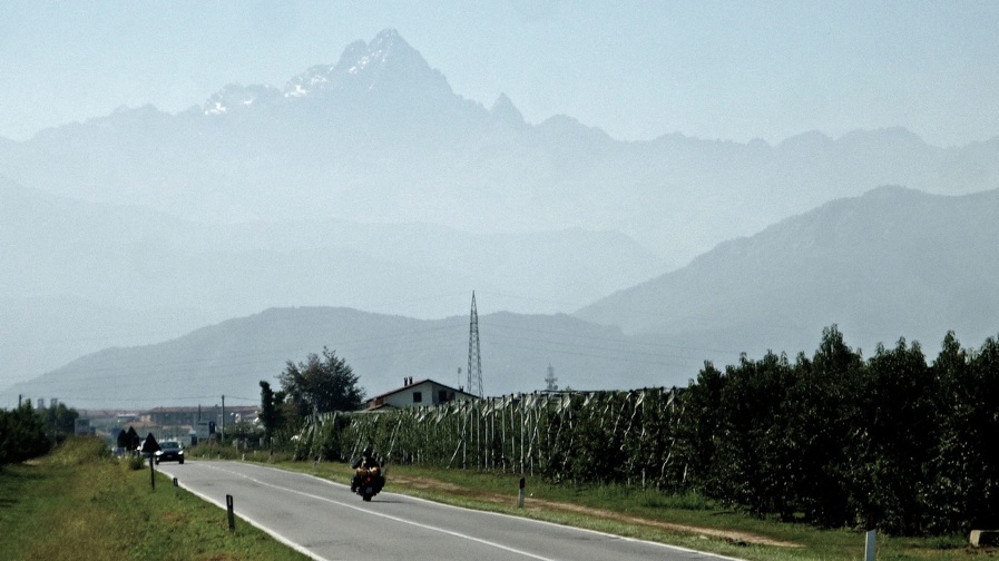 Die Dame des italienischen Autoverlad glich fehlendes Vokabular durch gellende Lautstärke aus, aber nun sitzen wir zufrieden in der Sonne, vor uns stehen zwei Cappucchini und Tostini, da wollen wir uns mal nicht beklagen. Die zu fahrende Himmelsrichtung ist klar: im Westen liegen die nächsten Berge. Turin umfahren wir in einem sehr weiten, südlichen Bogen. Kurven durch goldene Hügel, die Weinernte ist in vollem Gang. Wir breiten uns in aller Coolness auf den Highways aus – und werden sofort von telefonierenden Mädchen auf Rollern versägt. Zugegeben ist die Route kleinteilig und so erreichen wir erst am späten Nachmittag das Val de Chisone, in dem wir nächtigen wollen. Horden von japanischen Wurfgeschossen und Schottertouristen kommen uns entgegen und erzählen von Strassen aus Motorradfahrerträumen. Das „Camp Africa“ finden wir am Ende des Tals und somit deutlich höher als erwartet, locker 1400 m. Aber der betrunkene Platzwart tröstet uns: in dieser Nacht wird es bestimmt nicht schneien, wie in der Letzten.... Deshalb zeltet ausser uns auch niemand, aber wir haben ja Globetrotter das komplette Island - Equipment abgekauft. Thorstens Hammerschläge hallen durch das einsame Tal, der Tisch ist vorbereitet mit eiskaltem Wein und Vitello Tonnato, wir reden uns den lauen Sommerabend herbei, aber die Temperatur sinkt so schnell wie die Sonne.
