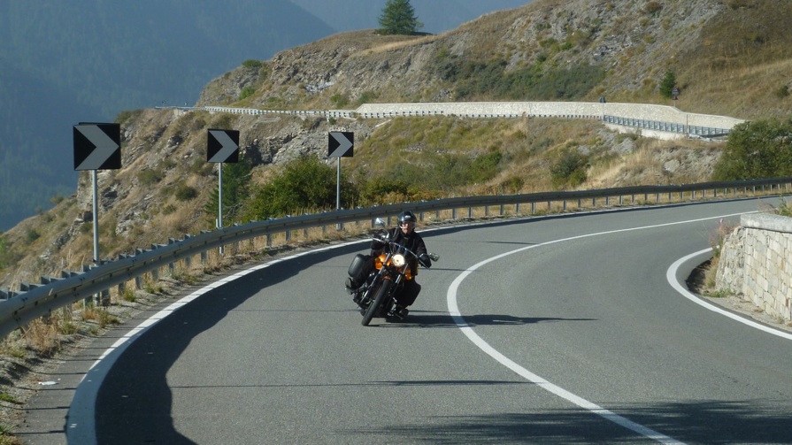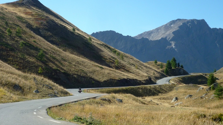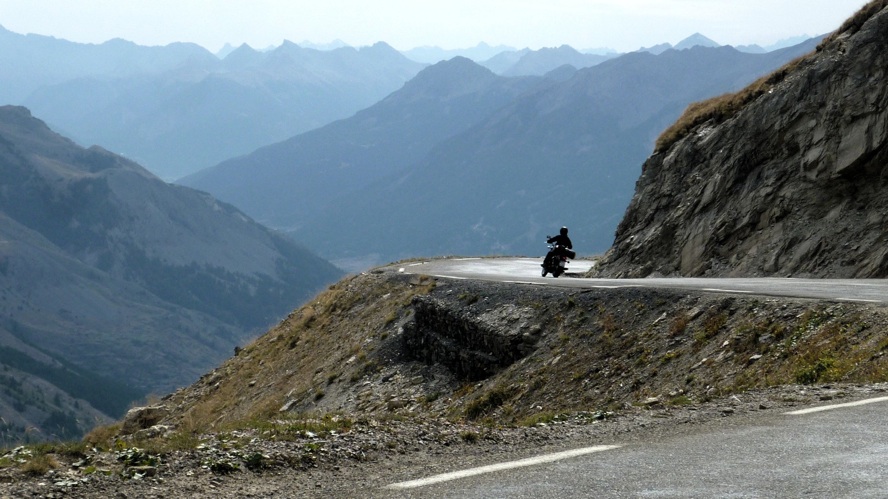 Die Nacht war SEHR SEHR kalt. Um 9 Uhr rollen wir deshalb schon wieder auf dem Asphalt den Berg hoch Richtung Briancon. Frühnebel lichtet sich, Sonnenstrahlen blinzeln auf Bergspitzen, bald leuchtet strahlend blauer Himmel und die Luft wird herrlich warm. Auf dem Weg liegen zwei Pässe: Sestrière und Montgenevre. Rennstrecken. Um uns herum wuseln jaulende Japaner, ballernde Einzylinder, aber die Masse sind BMW GSse. Ungerührt üben wir derweil, zügig, aber ohne Fussrastengeschrabbel um die Tornantii zu gleiten.