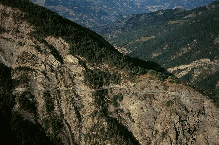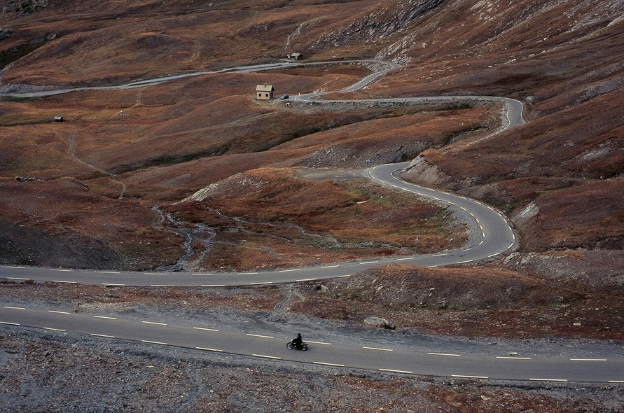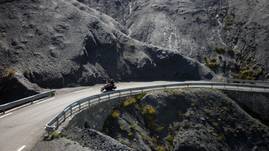 Wir sausen zurück nach Guillaume, immer tiefer bis in die Gorges de Daluis: rotbraune Steilwände, ein spektakulärer Canyon, die Straße oben an der Kante kunstvoll hineingemeißelt. Richtung Westen spürt man durch das Tal schon das Mittelmeer, die Pflanzen sehen anders aus, es ist warm, duftet und Zikaden zirpen. Wieder rollen wir die Hänge hoch, die Auffahrt zum Col d`Allos von Süden führt unter menschenleeren Sesselliften durch, gelbe Weiden mit rotbraunen Kühen. Murmeltiere flüchten genervt von der Strasse. Ganz anders die Abfahrt. Die sind wir auch schon gefahren, aber hatten sie verdrängt, die feldwegartige Buckelpiste zwischen Himmel und Erde, einspurig in die senkrechte Felswand geschnitten, der Abgrund immer eine Armlänge neben uns. Adrenalin im Abendrot. Thorsten schippert die dicke Vulcan souverän um alle Klippen. Nach ungezählten Kurven fallen wir tief zufrieden an der Bar ins Bier.