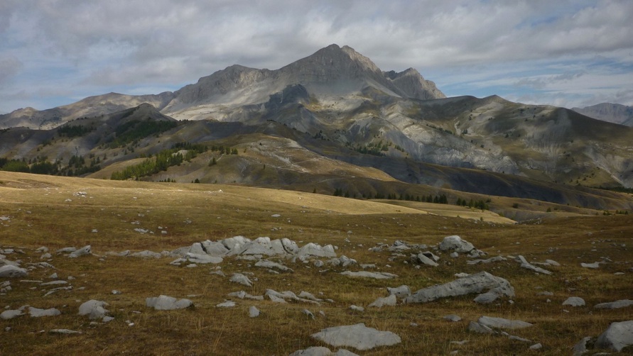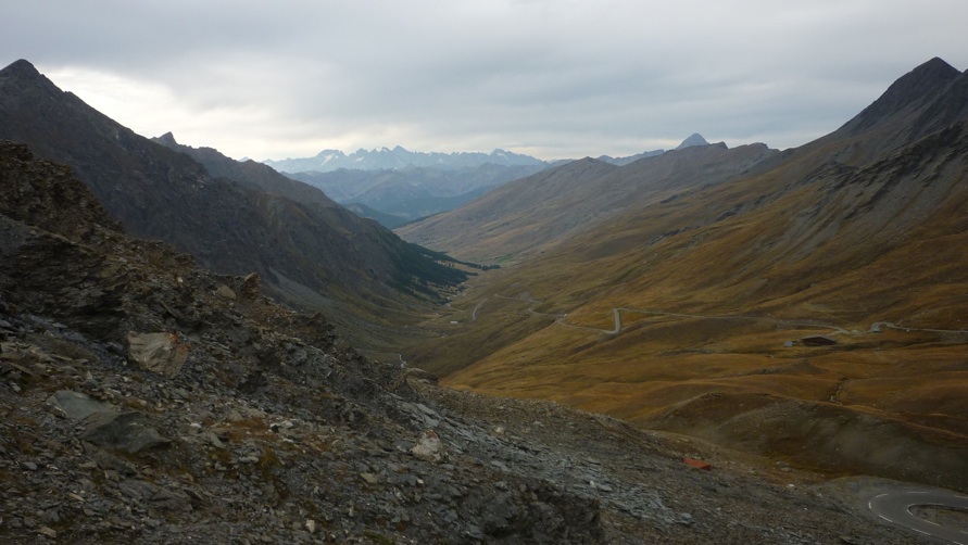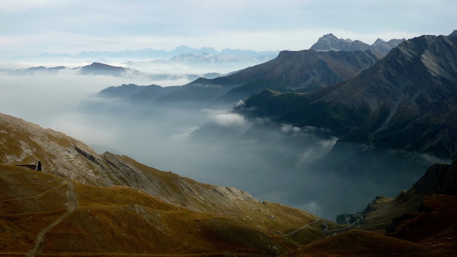 Das Ende liegt auf knackigen 2700m und wir bekommen Schnappatmung. Drüben liegt ein Wolkenmeer in der Frühabendsonne, einzelne Gipfel ragen wie Felsen in der Brandung heraus und darunter liegt irgendwo Italien. Kaum erkennbar stürzt die Strasse an den Abgründen entlang nach unten und verschwindet aus dem Blickfeld. Unser Zimmer liegt aber in Frankreich, so müssen wir umkehren, segeln durch tabakfarbene Hänge in die Tiefe zurück, vor uns die Skyline der Alpen.