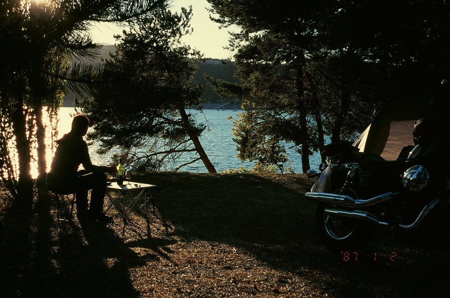 Faulenzerei. Zum Baden ist es uns nicht heiß genug, es reicht ein Eis am Meer. Der Himmel ist hier immer suppig. Zum Einkaufen starten wir einen Test auf der Honda zu Zweit, das ist nicht lustig. Da ich Satteltaschen verweigert hatte, trage ich den Rucksack mit Wasser und 11%igem, hänge wie Affe hinten drauf und jedes Schlagloch stampft sich durch die Wirbelsäule. Abends gehen wir in der platzeigenen Pizzeria, die inzwischen einen Swimmingpool und eine eitle Liegewiese hat, eine letzte Pizza essen, trinken und quatschen lange draussen. Campingplatzbewohner tasten sich mit Taschenlampen durch den lauen Abend.