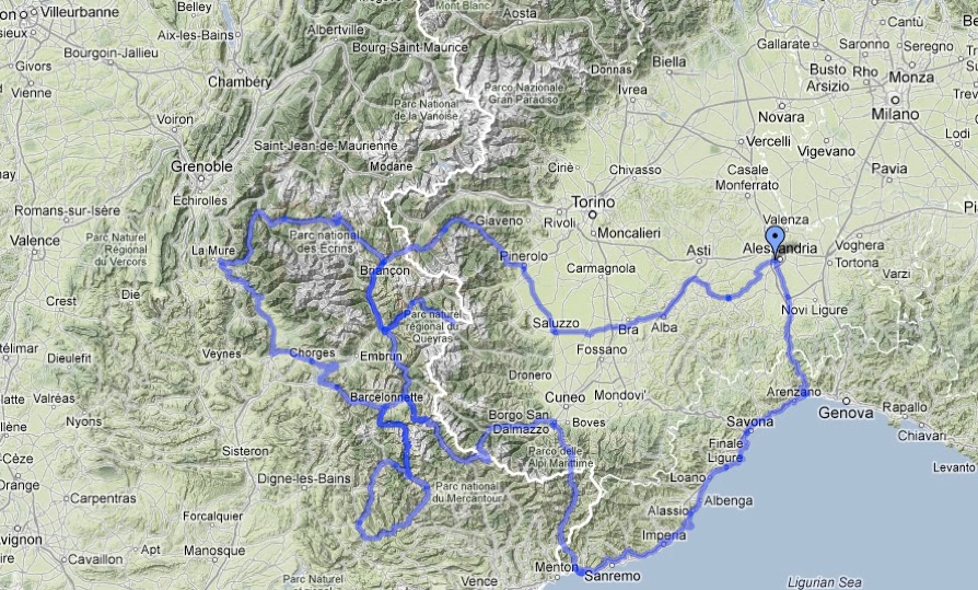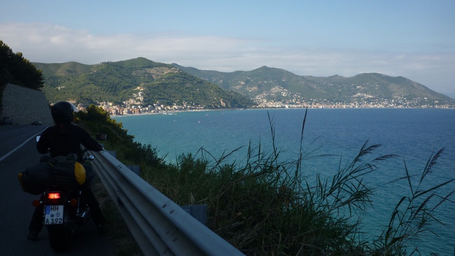 Routenplanung Mittelmeer, denn es droht Regen. In sehr frischer Morgenfrische über den Col de Larche. An der Baumgrenze wünschen wir uns unsere Griffheizung zurück. Hinter dem Pass tauchen wir in 15 Tornanten steil und schnell in das diesige Tal nach Italien ab. Kolonnen von Bikern kommen uns entgegen – es ist Wochenende und die Jungs haben viel vor. Wie gut, dass wir die Pässe gestern für uns allein hatten. Die Strasse führt durch Schluchten und Tunnel, rauschhaftes Kurvengleiten durch Italien, dann wieder Frankreich, wieder Italien. Die ersten Olivenbäume und Palmen grüssen, ein Schwall Wärme empfängt uns im Süden. In Ventimiglia spült uns der dichte Verkehr an die Küste. Wir gleiten durch die Städte mit der Armee von Rollern, die überall durchpassen, alles passend machen. Salzluft steigt uns in die Nase, wir lassen uns ohne Hast treiben, parken in Imperia vor einem mondänen Café und pimpen uns mit due Cappuccini. Unser Tagesziel ist der Campingplatz von 2009 in St. Marthino. Wir finden tatsächlich den sorgsam versteckten Abzweig und klettern das irrwitzige Strässchen durch den Ort, bis wir wieder auf „unserem“ Platz das Zelt entfalten. Kurz danach gluckert der Wein in die Kehlen. Nur der Gärtner Manolo und die Glühwürmchen sind nicht mehr da.