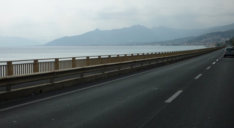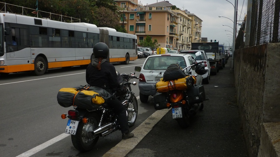 Letzter Tag. Um 9h30 fließen wir im Nieselregen zusammen mit der arbeitenden Bevölkerung auf der Küstenstrasse Richtung Genua. Vom Meer sehen wir nur selten etwas und in Vestri biegen wir ins Hinterland ab. Wir überwinden einen äußerst kleinen, steilen Pass durchs nasses Grün. Die Autobahn verläuft irgendwo oben als Betonstrang durch den Himmel. Es folgt ein ungewohntes Hindernis in diesem Land: kriechende Kleinwagen. Das holen wir unten in der Poebene mit 120 Sachen wieder raus, der Helm hängt fast hinter dem Kopf. Die hügellosen Felder stauchen sich unter bleischwerem Himmel und mit Alessandria erreichen wir unser Endziel und den ersten richtigen Regen. Egal jetzt. Am Marktplatz sitzen wir die Zeit bis zur Abfahrt ab, stapfen unbeeindruckt an der keifenden Verladefrau vorbei, belegen unser Abteil und lassen uns nach Norden gondeln, Füße hoch, den Blick aus dem Fenster auf die verschwindenden Bergketten.