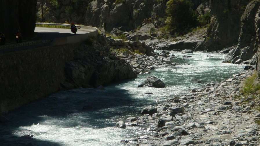 Inzwischen trinken wir Café au lait, und da der Col d´Iseran angeblich gesperrt ist, steuern wir den Izoard an. Die Serpents flutschen nur so unter unseren Reifen entlang und schnell ist die Baumgrenze erreicht. Felsnadeln wachsen aus dem Geröll, wieder pfeilen an uns die Turiner auf ihrer Hausstrecke entlang, hinten draufgeklemmt Ragazzi, gern im Disco-Outfit. Sie feiern oben auf der Passhöhe das Wochenende, wir geniessen eher abgeklärt die Weitsicht und wickeln uns bald den Pass wieder runter. Auf dem Weg nach Guillestre blubbern wir durch die spektakuläre Schlucht des Guil, vorbei an lauernden Fotografen, die tanzende Wildwasserkanuten schiessen wollen.